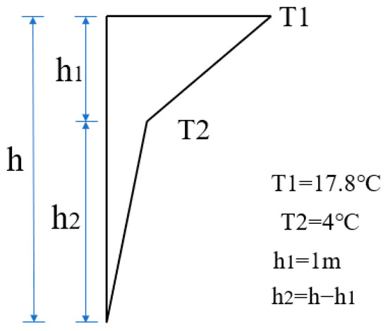 In Figure 13, the temperature exhibits a non-linear distribution in the vertical direction of the cross-section. The highest temperature reaches 44.6 °C while the lowest is 26.8 °C. Within the scope of 1 m from the top plate, there is a temperature difference of 13.7 °C. Within the range of 1 m and 3 m from the top plate, the temperature difference is merely 4 °C, indicating that the temperature variation is slight. The vertical distribution of the temperature in the cross-section approximately shows a double-segment linear pattern. The temperature difference in the upper part of the steel box is significant, while that of the lower part of the steel box is relatively small. On the basis of this, the thermal gradient model presented in this article is in the form of a double-fold line, and the greatest temperature disparity of the cross-section amounts to 17.8 °C. The temperature characteristic points are T1 = 17.8 °C, T2 = 4 °C, and h1 = 1 m. Refer to Figure 14. In contrast to the curve and multi-segment linear models, the double-segment linear temperature model presented in this paper simplifies the nonlinear issues of the temperature distribution, and meanwhile, it can efficiently mimic the crucial features of the actual temperature distribution.