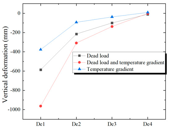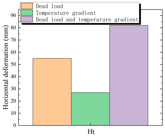 In Figure 17, the temperature gradient exerts the most significant impact on the deformation of the guide beam at the cantilever end of the structure. The deformation under the dead load is −586 mm, while the deformation induced by the temperature gradient is −376 mm. The deformation of the guide beam due to the temperature gradient makes up 39% of the total deformation. In Figure 18, the horizontal deformation of the tower structure under the effect of the dead load is 55 mm, and the deformation induced by the thermal disparity is 27 mm. The horizontal deformation at the top of the tower resulting from the temperature gradient makes up 33% of the total deformation.