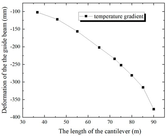 In Figure 19, with the increase in the cantilever length of the guide beam, the impact of the temperature gradient on the deformation of the guide beam is more significant, presenting a non-linear changing pattern. If the length of the guide beam’s cantilever is shorter than 35 m, the deformation of the front part of the guide beam is shorter than 10 cm. Once the cantilever length of the guide beam is longer than 75 m, the deformation rate of the front end of the guide beam speeds up, and the deformation value is over 25 cm. Thus, it is evident that the impact of the thermal gradient of the steel box girder on the structural deformation should not be overlooked. An overly large vertical deformation of the guide beam will lead to the bridge failing to pass the pier smoothly.