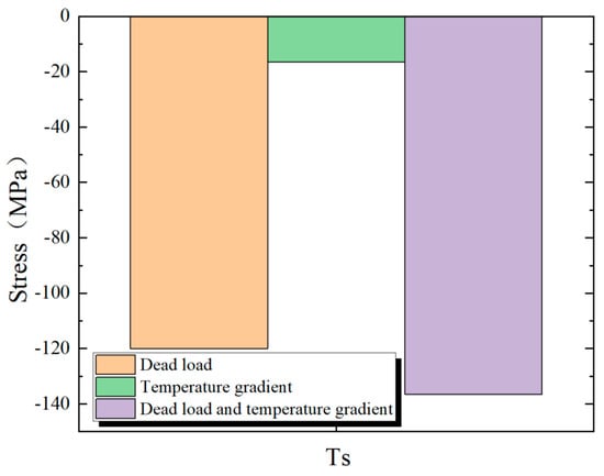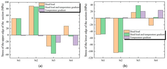 Figure 20 illustrates the contrast of the stresses at the key cross-sections of the guide beam and the steel box girder. In Figure 20, the temperature gradient alters the distribution pattern of the structural stress, and the extent of its impact on the stresses at the uppermost and lowermost margins of the cross-section vary. For instance, at the location of St3, under the action of the structural dead load, the stresses on the top and bottom margins of the steel beam are −33.8 MPa and 17.6 MPa. The stresses induced by the temperature gradient are −22.4 MPa and 20.8 MPa. The stresses brought about by the temperature gradient are nearly equal to those generated by the structural dead load.