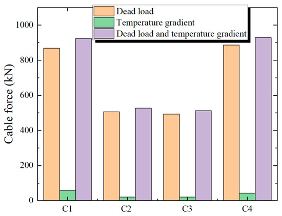 In Figure 21, the temperature gradient makes the stress at the bottom of the tower increase. The stress at the bottom of the tower under the action of the dead load is −120 MPa, and the stress generated by the thermal disparity is −16.5 MPa. The stress generated by the thermal disparity accounts for 12% of the total stress. In Figure 22, the temperature gradient leads to an increase in the force of the stay cable, and it exerts the most significant influence on the cable force at the cantilever end C1. When under the effect of the dead load, the force of the stay cable at C1 is 868.5 kN, the cable force resulting from the temperature gradient is 56.5 kN, and the cable force due to the temperature gradient makes up 6.1% of the total cable force. The temperature gradient has a rather slight influence on the cable forces of the stay cables from C2 to C4.
