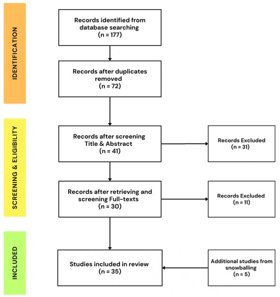 The search was limited to the “Title”, “Abstract”, and “Keywords” sections of papers. Subsequently, 177 results were retrieved, merged, and exported into Excel for further screening and selection. A first-stage screening of the “Title” and “Abstracts” was undertaken to filter the records. The selections from the first-stage screening were then taken through a second-stage screening, where the “full texts” of the papers are retrieved and screened to confirm eligibility for inclusion in the review. Snowballed papers, identified outside the initial search results, were similarly screened and included in the final selected articles.