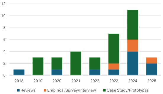 An increasing trend in publications on material passports and construction waste management is observed from the results presented in Figure 3. A significant growth in publications is identified between 2022 and 2025, contributing 23 (65.71%) papers, while 12 (34.29%) papers are identified between 2018 and 2021. The selected papers articles comprised 20 (57.14%) journals, 13 (37.14%) conference papers, and 2 (5.71%) book chapters. Of these, 22 (62.86%) constitute case studies/prototypes, 11 (31.43%) constitute reviews, and 2 (5.71%) constitute empirical surveys/interviews. The rising trend in publications signals growing interest in using material passports for construction waste management. The concept of material passports has evolved over the years, and its potential use in the construction industry is attributed to minimizing waste generated from the construction and the end-of-life process of buildings. While the general publication sample remains limited, advancement in prototype-based studies provides an avenue for systematic review into development approaches, identifying critical implementation factors, and future areas for improvement. A summary of the selected articles is provided in Table 2.
