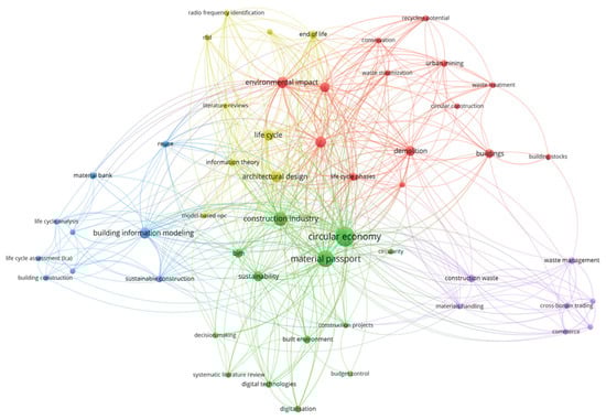 The keywords “material passports”, “circular economy”, and “construction industry” emerged as the most prominent connection nodes. The main keywords showed strong clustering connections with other keywords including “construction waste”, “waste management”, “cross-border trading”, “architectural design”, “life cycle”, “building information modeling” “demolition”, “decision-making”, “digital technologies”, “material banks”, “building stocks” among others. The findings from the keyword co-occurrence results corroborate the increasing publication trends and interest in applying material passports to minimize waste in the construction industry.