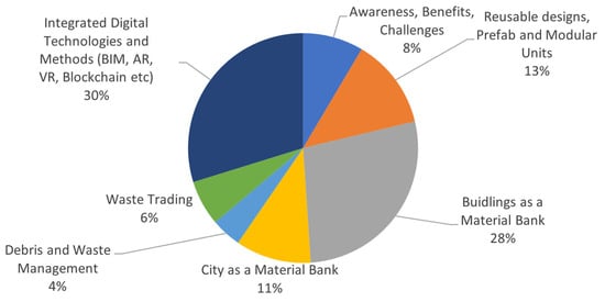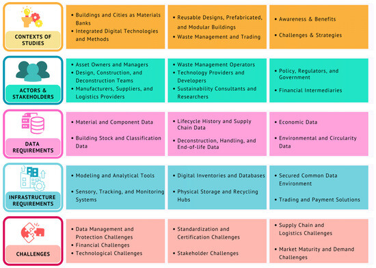 As illustrated in Figure 5, the context of studies in material passports for construction waste management is classified into “buildings and cities as material banks”, “integrated digital technologies and methods”, “reusable designs, prefabricated and modular buildings”, “waste management and trading”, and “awareness, benefits, and strategies”. The identified contexts are discussed further.