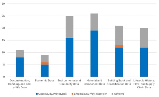 To support the creation of material passports, specific categories and types of data are collected to keep comprehensive product records. The categories of data types discussed in the selected studies are identified and reported in Figure 6 including “Material and Component Data”, “Building Stock and Classification Data”, “Lifecycle History and Supply Chain Data”, “Deconstruction, Handling and End-of-life Data”, “Economic Data”, and “Environmental and Circularity Data”.
