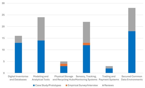 Similarly, essential tools, technologies, and physical infrastructure requirements are needed to support the development and operation of material passports. These are categorized and reported in Figure 7 to include “Modelling and Analytical Tools”, “Sensory, Tracking, and Monitoring Systems”, “Digital Inventories and Databases”, “Physical Storage and Recycling Hubs”, “Secured Common Data Environment”, and “Trading and Payment Solutions”.