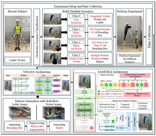 This study proposes a framework to monitor ladder operations in construction sites, with a particular focus on tracking assistant workers under occlusion scenarios. The framework consists of several key components: (1) experimental setup for data collection; (2) occlusion scenario classification; and (3) implementation of detection algorithms. Two different approaches are integrated in this framework: YOLO is implemented to detect the ladder and workers, while the SAMURAI algorithm is utilized to track assistant workers under various occlusion conditions, employing its motion-aware memory selection mechanism. Figure 1 provides an overview of the research framework, illustrating the workflow from data collection through detection algorithm implementation to performance evaluation. The details of each component are described in the following sections.