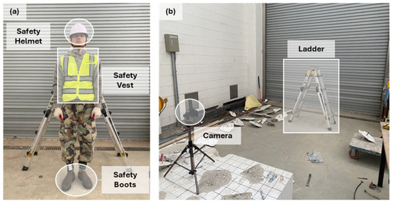 First, the authors recruited subjects to perform ladder operations, focusing on both the main worker’s and assistant worker’s roles. The workers were equipped with standard Personal Protective Equipment (PPE), including a safety helmet, high visibility safety vest, and safety boots, following construction site safety regulations, as shown in Figure 2a [52]. This standardized equipment ensures clear visibility and reflects real-world conditions.