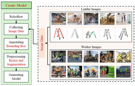 This study implemented the YOLOv8 model training process through Roboflow, focusing on ladder operation monitoring in construction sites. Roboflow is an online platform that streamlines the dataset preparation and model training workflow for computer vision tasks, including image annotation, preprocessing, augmentation, and YOLO integration. As shown in Figure 3, the dataset generation workflow consists of image data collection, bounding box annotation, preprocessing with augmentation, and model generation [53,54].