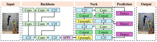 The neck network utilizes a feature pyramid structure with C2f blocks, concatenation operations (Concat), and upsampling layers to aggregate multi-scale features [57]. This structure enhances the model’s ability to detect both ladders and workers at various scales and positions. The spatial pyramid pooling fusion (SPPF) between the backbone and neck networks further improves the model’s capability to handle objects at different scales [58].
