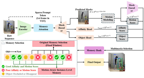 The memory selection process categorizes frames based on three criteria: Good Affinity and Motion Score (indicated by green check marks), Poor Affinity or Motion Score (indicated by red crosses), and Object Occluded or Disappear (indicated by yellow emoticons). This classification guides the selection of relevant frames for maintaining tracking continuity. The system carefully evaluates each frame’s contribution to tracking reliability, ensuring that only high-quality tracking information is retained in memory. The Motion-Aware Memory Selection implements three key features: Information from Previous Frames, Temporal Continuity, and Continuous Tracking Capability. These features work together to create a robust tracking system that can maintain object identity through various occlusion scenarios.