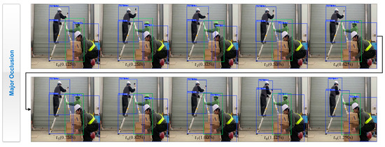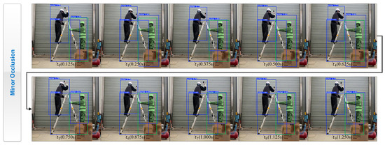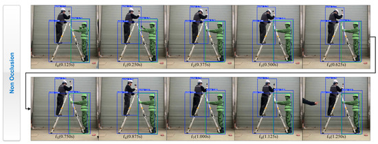 Figure 6 presents the tracking results for the non-occlusion scenario (Class 0), establishing a baseline for evaluating the system’s performance under optimal conditions. This sequence captures the assistant worker and ladder with full visibility, devoid of any occlusions, ensuring an ideal test case for assessing tracking stability and object localization accuracy. From t_0 (0.125 s) to t_9 (1.250 s), the system successfully maintains consistent tracking across 10 frames. Bounding boxes around the assistant worker and ladder exhibit minimal positional shift across frames, indicating the robustness of the detection pipeline. The confidence scores for the assistant worker range from 0.71 to 0.82, while the ladder maintains confidence levels between 0.87 and 0.90, ensuring reliable detection continuity. Notably, the fluctuation in confidence scores remains below 0.05 across frames, demonstrating minimal uncertainty in object classification.