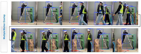 Figure 8 presents the tracking results for the major occlusion scenario, where the assistant worker is significantly occluded by another worker handling cardboard boxes in the foreground. This sequence evaluates the system’s ability to maintain tracking continuity when the assistant worker is mostly hidden from view.