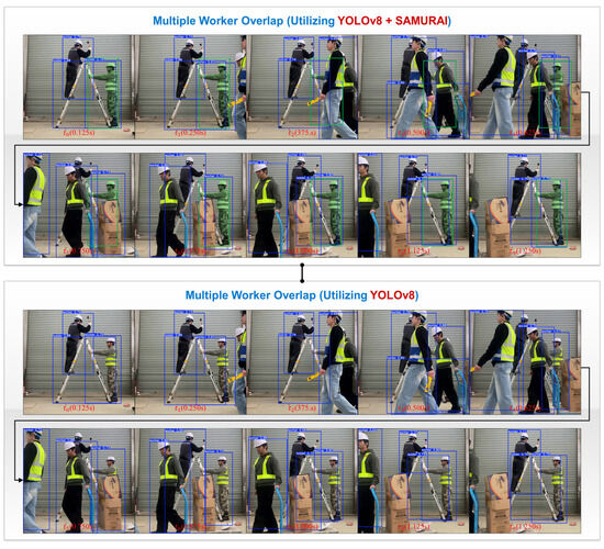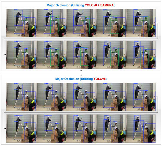The performance evaluation of the proposed system focused on SAMURAI’s tracking capabilities in occlusion scenarios through frame-by-frame analysis. The evaluation examined the system’s ability to maintain continuous tracking of assistant workers during ladder operations, particularly when occlusions occur.