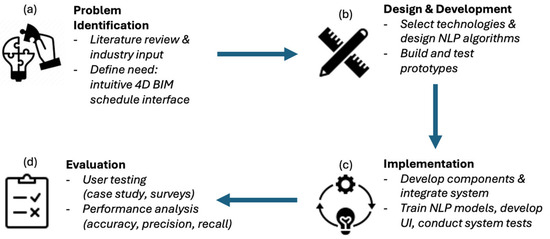 Research methodology diagram. (a) Problem identification; (b) Design and development; (c) Evaluation; (d) Implementation.