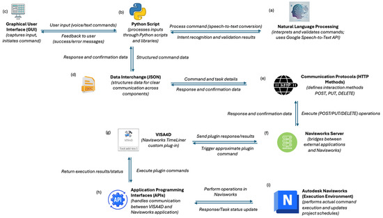 System workflow and component interaction diagram for VISA4D. (a) Natural Language Processing (NLP); (b) Python script; (c) Graphical User Interface (GUI); (d) Data interchange (JSON); (e) Communication protocols (HTTP methods); (f) Navisworks server; (g) VISA4D; (h) Application Programming Interfaces (APIs); (i) Autodesk Navisworks (execution environment).