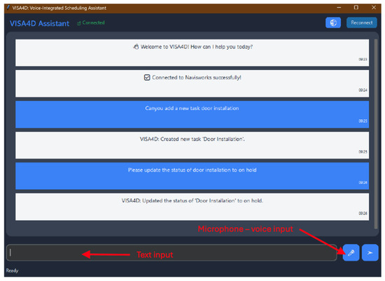 The GUI layer (Figure 2c) serves as the primary interface between users and the VISA4D tool and facilitates both text- and voice-based interactions. This layer was implemented using the customtkinter library, which extends Python’s Tkinter capabilities to create a more refined and interactive interface. The dual-input modality is a key implementation feature of VISA4D, which allows users to interact through both conventional text inputs and voice commands (Figure 3). The voice input functionality, particularly valuable for enabling hands-free operation for site superintendents, was implemented using SpeechRecognition library, utilizing Google’s Speech-to-Text API as its transcription backend.
