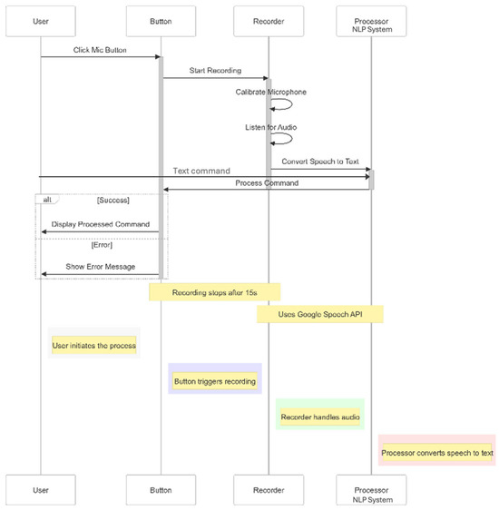 Upon activation through the microphone button (as shown in the system sequence diagram in Figure 4), the system initiates a sequence of operations that begins with microphone calibration using SpeechRecognition, followed by audio recording with appropriate timeout mechanisms. The recorded audio undergoes processing and conversion to text, and is treated as a text command moving forward, which is routed to the NLP system for analysis and task execution. If the input is a text command, then the processing is the same, except for the microphone calibration.