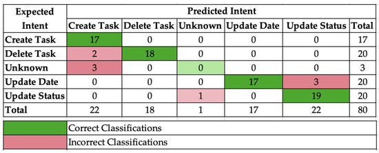 The intent classification phase is designed to accurately categorize user commands based on their specific operational intent. This includes commands for creating tasks, updating statuses or dates, and deleting tasks. The classification system encompasses four primary intent categories: create_task, update_status, update_date, and delete_task. Any command that does not conform to these defined categories is classified as unknown.