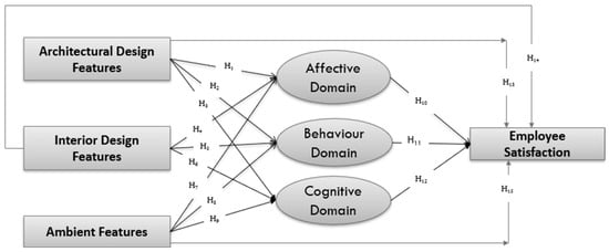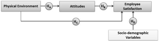 The qualitative assessment identified specific components of the physical environment that significantly influence employee attitudes and satisfaction in private hospitals. For ADF, key aspects such as spatial layout, personal space, and window view were found to impact how employees perceive and interact with their work environment. In terms of IDF, factors such as seating arrangements, furniture, color, and indoor plants emerged as influential in shaping comfort and satisfaction. With respect to AF, the elements of temperature, noise, air quality, and lighting were highlighted as having a direct effect on employee well-being and workplace experience. Based on the literature review, the research hypotheses are defined. The physical-environment parameters (i.e., ADF, IDF, and AF) are hypothesized to affect both employees’ attitudes () and their satisfaction (). Moreover, different sociodemographic variables, such as age, gender, marital status, working hours, and experience, are hypothesized to have direct effects on employee satisfaction at private hospitals (Figure 1 and Figure 2).