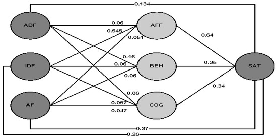 As discussed in the previous section, this study hypothesizes that the physical environment influences employees’ attitudes, which in turn affect their overall satisfaction (Figure 1). To evaluate these relationships, bivariate correlation analyses were conducted between the relevant independent and dependent variables (Figure 2). To examine the influence of the physical environment on employee attitudes, ADF, IDF, and AF were considered independent variables, whereas the attitudinal dimensions were treated as dependent variables. To assess the direct relationship between the physical environment and employee satisfaction, physical-environment parameters (ADF, IDF, and AF) were used as independent variables, with SAT as the dependent variable. Additionally, to test whether employees’ attitudes influence their satisfaction, the attitude constructs (AFF, BEH, and COG) were considered independent variables, and satisfaction (SAT) was the dependent variable. Pearson correlation coefficients were computed, and significance was evaluated at the 0.05 level. A p value less than or equal to 0.05 was considered statistically significant, indicating support for the alternative hypothesis. The correlation coefficients and associated p values are presented in the following tables.