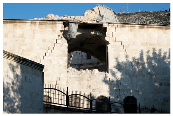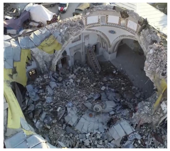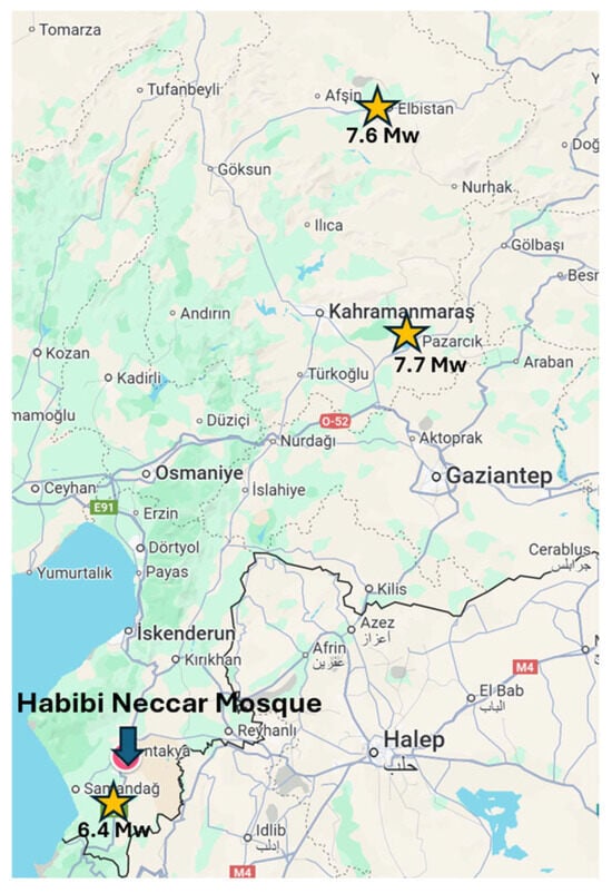 - Kocaman, İ. The effect of the Kahramanmaraş earthquakes (Mw 7.7 and Mw 7.6) on historical masonry mosques and minarets. Eng. Fail. Anal. 2023, 149, 107225. [Google Scholar] [CrossRef]