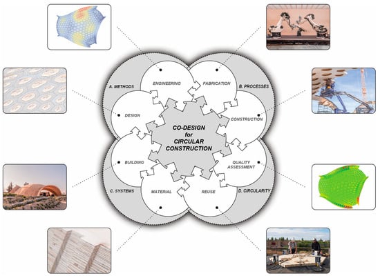 Co-Design describes a rather novel approach that merges the reciprocal interrelations of processes, methods, and systems into one integrative design and construction methodology, which efficiently harnesses the full potential of digitalization [35,36,37]. In the context of circular construction, Co-Design offers the potential for innovative and functional solutions through inclusive and collaborative decision-making, balancing technical performance with environmental and social concerns in accordance with the design criteria established at the outset of a project. The authors propose an extension to the fundamental principles of Co-Design by integrating design principles and advanced quality assessment models for reusable building systems toward circular construction. In this context, the BUGA Wood Pavilion, a lightweight segmented timber shell structure [38,39], serves as an excellent case study for the investigation and evaluation of the proposed design methodology, henceforth referred to as Co-Design for circular construction (illustrated in Figure 1).