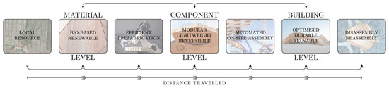 On a material level, a sensible selection of the employed building materials is of crucial importance. Renewable materials of low energy production and low environmental impact represent a core requisite for sustainable construction [11,12,56]. In the case of the BUGA Wood Pavilion, engineered timber, i.e., laminated veneer lumber (LVL), proved to be the optimal choice due to its high structural performance, dimensional properties, strength, and rigidity. On a component level, the building system design must allow for its efficient manufacturing, construction, and deconstruction, including strategies for reuse and recycling. In this context, the building components must be transportable and feature a reversible connection design using reusable connectors [57]. In addition, the building system must accommodate a high degree of functional integration paired with a modular composition of all building layers, enabling their clean separation after use [24]. On a building level, sustainable design should minimize material consumption through shape or topology optimization of the structure or its components. Moreover, building designs should seek to maximize their lifespan, enabling adaptive strategies for future reuse or expansion at low cost and without additional excessive planning efforts. Figure 3 illustrates the integration of the principles of circular construction for segmented timber shells.