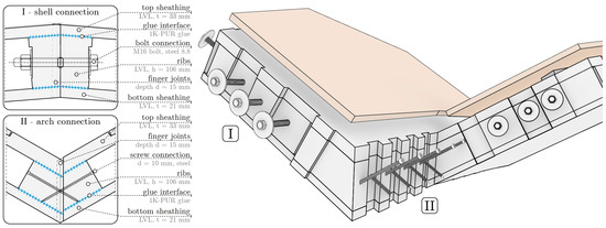 Connection design of the BUGA Wood Pavilion. I—shell connection: reversible bolt and finger joint connection. II—arch connection: non-reversible screw-and-finger joint connection (adapted from [38]).