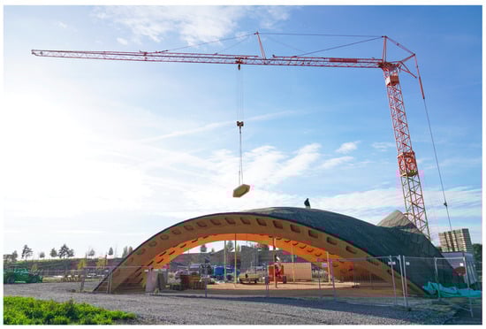 The BUGA Wood Pavilion is a long-span segmented timber shell initially planned for the Federal Horticultural Show in 2019 (in German: Bundesgartenschau or BUGA) in Heilbronn, Germany. After a service life of four years, the pavilion was relocated to the subsequent BUGA 2023 in Mannheim, Germany (see Figure 2). Developed in an interdisciplinary research venture at the University of Stuttgart [48,49,50,51,52,53,54], the segmented timber shell utilizes the integrative approach of Co-Design by incorporating computational design, engineering, and robotic fabrication technologies [36] to assess the potentials of STSs toward resource-efficient and reusable structures [55]. Today, the BUGA Wood Pavilion is part of the family of innovative building demonstrators developed within the Cluster of Excellence “Integrative Computational Design and Construction for Architecture” (IntCDC) at the University of Stuttgart.