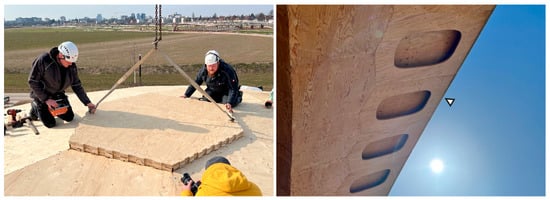 The dismantling of the BUGA Wood Pavilion was completed in early December 2022. In late January of 2023, the reconstruction of the timber shell in Mannheim began. The same team of three craftsmen completed the load-bearing structure of the timber shell in only twelve working days (see Figure 7, left), reusing all of the 376 timber cassettes, all 107 steel parts (30 box profiles and 77 steel components), and approximately 90% of the 4262 fitting bolts.