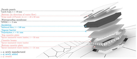 Prior to its relocation to Mannheim in 2023, the BUGA Wood Pavilion underwent various design studies for a possible extension into a permanent building, serving as a multifunctional event space for year-round use, as illustrated in Figure 8. These investigations included a partial retrofitting of the timber shell by reusing its hollow wooden cassettes, its connectors, and its supporting steel components, and adding new layers of softwood fiber insulation, a vapor barrier, battens, and façade panels (see Figure 9). In addition, the installation of a glass façade along the three large openings enables the structure to be closed completely (see Figure 8). In turn, this glass façade allows extensive opening, transforming the pavilion into a canopy-like building for summer events.