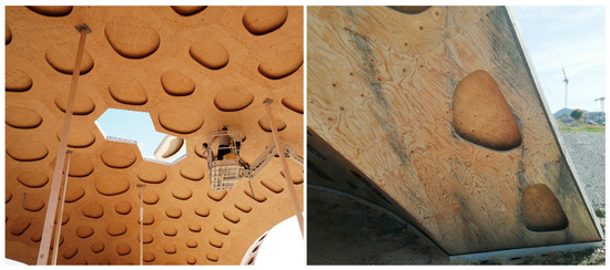 The first visual inspection of the shell in late 2022, after almost four years as an open canopy structure, revealed only minor defects. The body of the timber shell, which was protected against rain and splash water on both its exterior and interior surface, did not show any visual abnormalities and appeared almost as new (see Figure 10, left). There were no noticeable defects regarding damage to the exterior of the shell, which was still covered by the waterproofing membrane. The cassettes inspected from the underside predominantly displayed a high degree of preservation and no visible defects, e.g., resulting from moisture. Exceptions to the very good state of preservation of the timber pavilion were at its north-eastern and north-western edges, particularly in the arch and wing areas. The bottom plates of the arch cassettes that were not fully protected against rainwater displayed obvious traces of water flow, which were noticeable as colored stains (see Figure 10, right). These discolorations proved to be exclusively superficial, not affecting the structural integrity of the components and requiring only sub-millimeter surface sanding to remove. Subsequent application of a wood preservative varnish and a water-repellent, protective, and color-balancing bio-based coating improved the appearance and durability of the cassettes. In addition, wood moisture measurements at these locations resulted in wood moisture levels above fiber saturation (28–32%) in several instances; however, there were no signs of wood degradation or fungal infestation.