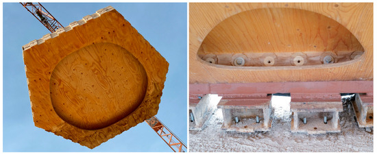 Furthermore, the condition and structural integrity of the bolt holes in the timber cassettes were thoroughly assessed during the 2022 inspection, with particular attention given to numerous locations and structurally critical points of the shell, ultimately confirming that all inspected connections remained intact and suitable for continued structural reuse of the timber shell (see Figure 11, right).