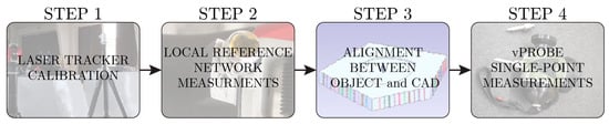 When measuring with a laser tracker, ambient environmental conditions can have significant effects on the measurement results, as the employed laser tracker may be highly susceptible to fluctuations in temperature, humidity, or other external influences such as vibrations. The laser tracker measurements on cassette 348 were carried out in February 2023 at approximately 1.6 degrees Celsius in a semi-open factory hall, which was subject to ambient vibrations caused by construction work and heavy machinery. Consequently, not all measured points could be used for a proper analysis during data processing, requiring the entire dataset to be filtered first to remove any measuring noises. Figure 12 illustrates the sequential workflow of the measurement procedure of the timber cassettes using a laser tracker.