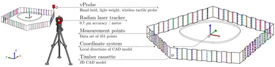 The laser tracker and vProbe must be calibrated and georeferenced in a local environment by measuring at least four stable points in its vicinity, which establishes a local coordinate system for all following measurements. In a subsequent step, the object itself must be properly located in relation to the CAD (computer-aided design) model. A conventional prismatic SMR (spherically mounted retroreflector) made by API for laser tracking was used to measure 22 points on the object’s surface to align the planned vProbe measurements with the CAD model [58]. These points were required solely for the described alignment and were not considered during analysis. Following successful alignment, all vProbe measurements were performed using one laser tracker position. Given the ambient environmental conditions, the stability of the device was prioritized to prevent possible shifts when merging datasets from multiple device positions in post-processing mode. This method entailed rotating the timber cassette to obtain all the required points on each of its surfaces. The measuring technique using vProbe is based on the use of additional tips, which form an angle of 90 degrees to the measuring point. In total, 451 points were measured for timber cassette 348. Figure 13 illustrates the measurement setup employed and the final dataset with all measured points.
