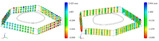 Comparison of measured points using a laser tracker with the CAD model of timber cassette 348 of the BUGA Wood Pavilion. (Left) Results of the measurements of survey 1 in Heilbronn in 2019. (Right) Results of the measurements of survey 2 in Mannheim in 2023.