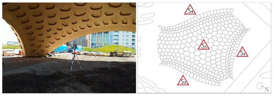 The geodetic measurements of the BUGA Wood Pavilion were conducted after its construction in Heilbronn in March 2019, once again during the summer, as well as after its reconstruction in Mannheim in 2023. Terrestrial laser scanning (TLS) was used to create a 3D geometry of the finished shell [60]. The employed laser scanner (model Leica HDS7000, Leica Geosystems AG Heerbrugg, Switzerland) measures horizontal and vertical angles, as well as distances. Such a scan can also be used to calculate the 3D coordinates that represent the so-called point cloud. The measurements were carried out with a resolution of 6.6 mm at a distance of 10 m. The measurement accuracy is 3.1 mgon for the angular measurements, and the noise for the distance measurements is given with an RMS of 0.5 mm at 10 m [61]. Since one single scanner position cannot capture the entire geometry of the shell due to occlusions, measurements from multiple scanner positions are used. One position was chosen in the center of the pavilion to be able to obtain a proper overview of the main body (S1). The other three stations (S2–S4) were located outside the pavilion at the midspan of the shell’s arches to capture them as accurately as possible. Figure 15 illustrates the employed measurement setup.