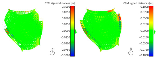 The laser scanner measurements carried out in the different surveys enable comprehensive tracking of the long-term deformations of the timber structure. As wood is a natural building material, changes in geometry may also be observed because of seasonal influences. In this study, however, the focus lies on the potential change in the geometry of the segmented timber shell as a result of its dismantling and relocation. For reasons of comparability, both recordings of the BUGA Wood Pavilion, the first conducted in Heilbronn in 2019 and the second in Mannheim in 2023, were performed in early spring, shortly after the respective assembly of the timber shell. Using the ICP method [62], an RMS of the registration of 4 mm could be achieved. The implementation of cloud-to-mesh (C2M) comparisons of the measured point clouds with the CAD model enabled a thorough analysis of the geometric quality of the timber shell. This comparison identified deviations along the shell arches with a maximum of up to 10 cm for both site locations (see Figure 16).