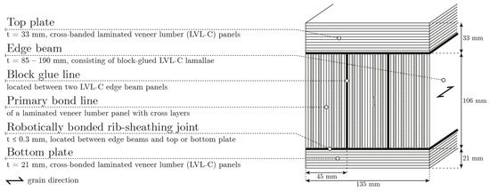 The cross-sectional build-up of the double-skin compound elements is illustrated in Figure 17, indicating the different bond line types. The edge beams are glued to both plates with their veneer layers aligned perpendicular to the plane of the plates, resulting in primary (referred to as a primary bond line in Figure 17) and secondary (referred to as a block glue line in Figure 17) bond lines orientated perpendicular to the plane of the cassette. This means that the cross-plies of the edge beams oriented perpendicular to the beam axis are glued to the plates at their end grain faces.