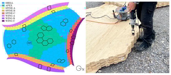 Reconstruction of the BUGA Wood Pavilion 2023 in Mannheim, Germany. (Left) Assembly of the final timber cassette. (Right) Thin metal sheet protecting the narrow outer edge of the shell components along the wings (indicated by a triangle symbol).