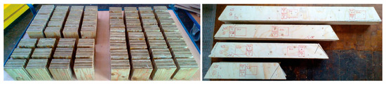 The edge beams (or ribs) exhibit a cross-sectional depth of 106 mm (in the direction of the cassette thickness) and, prior to their final milling, provided a range of cross-sectional widths from 85–350 mm (in the direction of the cassette plane). The ribs consist of 2–7 bonded laminations of cross-banded laminated veneer lumber LVL-C, specifically laminations of the brand Kerto-Q, in accordance with EN 14734 [76], produced by the company Metsäliitto Cooperative, Metsä Wood, Building Products, Metsä, Finland. The thicknesses of the individual Kerto-Q lamellae composed of one rib are in the range of 40–45 mm, consisting of three (lamella thickness: 44 mm) or four (lamella thickness: 40 mm and 45 mm) cross-oriented veneers running at an angle of 90° to their outer layers. The degree of orthotropy in the plane of lamination (Ʃ thickness transverse layers/Ʃ thickness longitudinal layers) is 0.25–0.4. The rib length varies depending on the size of the timber cassette from about 0.5 to 2.0 m.