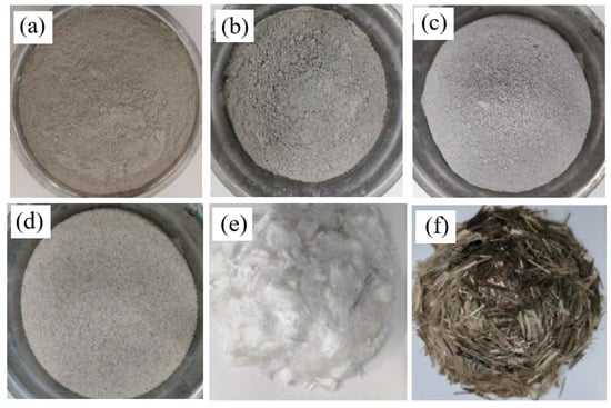 Main raw materials for HFECC: (a) cement; (b) fly ash; (c) silica fume; (d) quartz sand; (e) PE fibers; (f) BFRP fibers.