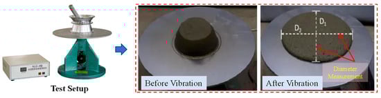 For the flowability test, the jump table method was used to determine the flowability of each HFECC group according to the GB/T 2419-2005 “Test method for fluidity of cement mortar” [33]. The entire test process was conducted in a constant temperature and humidity environment (20 ± 2 °C, relative humidity ≥ 50%). After the HFECC was evenly mixed using a planetary mortar mixer, the prepared mortar was placed in a truncated cone mold with an upper diameter of 70 mm, a lower diameter of 100 mm, and a height of 60 mm (as shown in Figure 2). The mortar was filled in two layers, each layer was compacted 15 times vertically with a standard 20 mm diameter tamping rod, and the surface of the mold was then leveled. After removing the mold, the standard jump table device was activated, completing 25 jumps with an amplitude of 25 ± 1 mm and a frequency of 1 Hz. The flowability of the material was then determined.