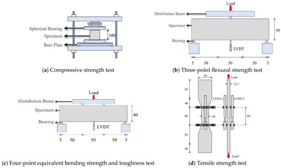 The tensile strength test followed the JC/T 2461-2018 “Test methods for mechanical properties of high ductility fiber reinforced cementitious composites” [38]. Standard dog-bone-shaped specimens were used, with a central cross-section of 30 mm × 15 mm and a gauge length of 80 mm. The specimens were subjected to uniaxial tension in an electronic universal testing machine. The loading rate was displacement-controlled at 0.1 mm/min. According to the test procedure, six specimens were used in each group. The average of the six measured values was taken as the initial crack tensile strength, ultimate tensile strength, and ultimate elongation of the group. The specimen geometry and clamping method are shown in Figure 3d.