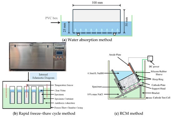 For durability performance testing, the tests were conducted in accordance with the GB/T 50081-2019 “Standard for test methods of concrete physical and mechanical properties,” the GB/T 50081-2019 “Standard for test methods of concrete physical and mechanical properties,” and the GB/T 50082-2024 “Standard for test methods of long-term performance and durability of ordinary concrete” [39], including a water absorption test [40], freeze–thaw cycle, and chloride ion penetration resistance tests. For the water absorption test, the standard 100 mm cubic specimens were used. Each group contained three parallel samples. The specimens were cut to dimensions of 50 mm × 100 mm × 100 mm. Then, they were dried to a constant weight in a forced-air oven at 105 ± 5 °C, with the mass change rate between two consecutive 24 h periods being less than 0.2%. After cooling, the dry mass was accurately measured. The specimens were subsequently fully submerged in a (20 ± 2 °C) constant temperature water bath, with a submersion depth of 25 mm. Following a procedure similar to ASTM C1585 [41], the specimens were removed every 24 h, the surface moisture was carefully wiped off, and the saturated surface-dry mass was recorded [42]. This procedure was repeated until the mass variation between two consecutive measurements was less than 0.2%. The final result was the arithmetic mean of the values from the three specimens. According to the specification, if the maximum or minimum value among the three differs from the median by more than 5%, both the maximum and minimum values are discarded, and the median is taken as the result. If both the maximum and minimum values differ from the median by more than 5%, the test result for that group is considered invalid. The schematic of the test setup is shown in Figure 5a. The rapid freeze–thaw cycle method was used to assess the frost resistance of the concrete. Each condition had three specimens. The specimens were 100 mm × 100 mm × 400 mm prisms, which were cured for 60 days before testing. The freeze–thaw temperature range was set from +20 °C to −20 °C, with each cycle lasting 4 h. The test continued until 200 cycles were completed or the mass loss exceeded 5%. Freeze–thaw cycles were set at 0, 50, 100, 150, and 200 cycles. After the specified number of freeze–thaw cycles, the arithmetic mean of the values of mass loss and dynamic elastic modulus was calculated. A schematic of the test setup is shown in Figure 5b. For chloride ion penetration resistance, the rapid chloride migration (RCM) method was used. The specimens were Φ100 mm × 50 mm cylinders. Each group consisted of three specimens. After saturation, the specimens were placed in the RCM testing device, and a DC voltage was applied at both ends. After the test was completed, the specimen was broken at the center, and a 0.1 mol/L silver nitrate solution was sprayed. The rapid chloride migration coefficient (DRCM) was then calculated according to the measured arithmetic mean of the values for each condition. If the maximum or minimum value deviates from the median by more than 15%, that value is discarded, and the mean of the remaining two values is used. If both the maximum and minimum deviate from the median by more than 15%, the median value is taken as the final result. A schematic of the test setup is shown in Figure 5c.