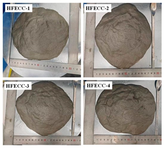 Figure 6 shows the appearance of HFECC during the flowability test under the four mix ratios. As shown, although there were slight differences in the flow behavior in the details of each mix, the overall flowability performance was relatively similar, with all mixes demonstrating good spreadability. This indicated that all mix ratios exhibited good workability. In HFECC-1, the paste edges were smooth, and the expansion was uniform, suggesting stable flowability. As the BFRP fiber content gradually increased (from 0.20 vol.% to 0.35 vol.%), the change in the expansion range was minimal, and no obvious fiber aggregation or stratification was observed. This indicated that, within the experimental design range, the increase in fiber content did not significantly negatively impact the flowability of the paste. Additionally, the slight adjustment in PE fiber content had a mild effect on flowability, mainly reflected in the uniformity of fiber distribution and the detailed changes in the expansion shape. Overall, all four mixes achieved good fiber dispersion and flow stability, with no segregation or bleeding issues in the paste.
