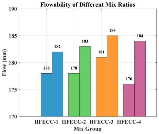 Figure 7 presents the flowability test results of HFECC under the four mix ratios. As shown in the figure, the flowability of the four mixes was approximately 180 mm. As the BFRP fiber content increased from 0.20% vol.% to 0.35% vol.%, while the PE fiber content decreased from 1.40% vol.% to 1.25% vol.%, the flowability initially increased and then decreased. Specifically, when the BFRP content was 0.30% vol.% (HFECC-3), the flowability reached its highest value of 183 mm. However, further increasing the BFRP content to 0.35% vol.% (HFECC-4) caused the flowability to drop to 180 mm, with the expansion decreasing to a minimum value of 176 mm. The observed variation trend was primarily attributed to the combined influence of fiber type, surface characteristics, and volume content. PE fibers were characterized by smooth surfaces and high flexibility [43], which allowed them to be aligned along the flow direction under shear forces, thereby promoting uniform dispersion and reducing flow resistance. In contrast, BFRP fibers were associated with higher stiffness and rough, hydrophilic surfaces, which facilitated water absorption [44] and the formation of a skeletal structure within the cementitious matrix. When the BFRP fiber content was maintained at a moderate level (0.30 vol.%), a slight increase in matrix viscosity was introduced due to the enhanced rigidity, while the reduced PE fiber content led to decreased fiber entanglement, resulting in improved flowability. However, when the BFRP content was further increased to 0.35 vol.%, flowability was reduced, as greater water absorption and intensified fiber interlocking led to higher internal resistance within the matrix. Consequently, the changes in flowability across different mixtures were governed by the synergistic effects of fiber stiffness, fiber–matrix interfacial behavior, and the total fiber volume fraction [45].