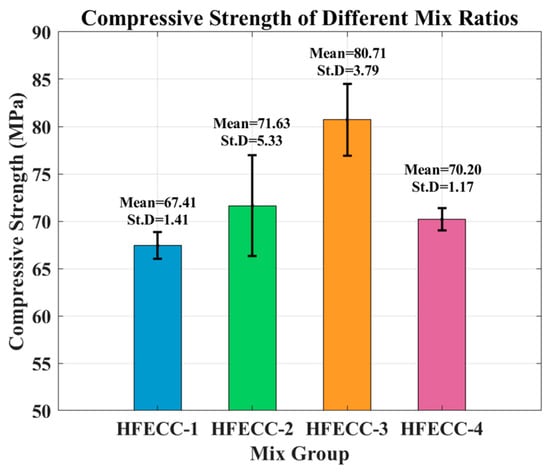 Figure 8 shows the compressive strength results of HFECC under the four mix ratios. It could be observed that fiber content and mix ratios had a significant impact on the compressive strength. Among them, the HFECC-3 mix exhibited the best compressive performance, with an average compressive strength of 80.71 MPa. This was 16.5%, 11.3%, and 13.0% higher than the values for HFECC-1 (67.41 MPa), HFECC-2 (71.63 MPa), and HFECC-4 (70.2 MPa), respectively. This phenomenon suggested a significant synergistic enhancement effect of the two fibers at a specific ratio. Notably, when the BFRP fiber content exceeded 0.30% vol.% (as in the HFECC-4 mix), the compressive strength significantly dropped. This could be attributed to the excessive BFRP fibers causing a decrease in matrix uniformity, resulting in localized stress concentration points. In addition, longer basalt fibers (15 mm in this study) can form a more effective three-dimensional network within the concrete matrix, which helps to distribute stress and enhances the overall compressive strength of the structure. This viewpoint was confirmed in the compressive strength tests of BFRP-fiber-reinforced concrete conducted by Zhang et al. [46].